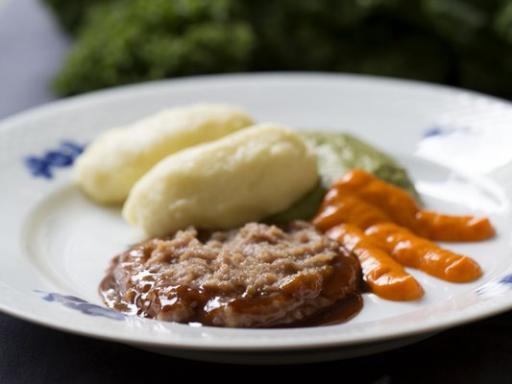 Glaseret hamburgerryg med stuvet grønlangkål, kartofler og bagte gulerødder (cremet)