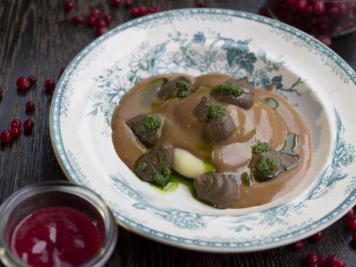 Kalvehjerter i flødesauce, kartoffelmos, tyttebær og persille (cremet)