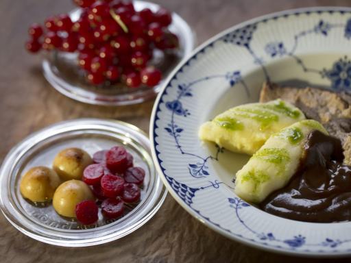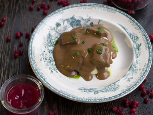 Kalvehjerter i flødesauce, kartoffelmos, tyttebær og persille (gratin)